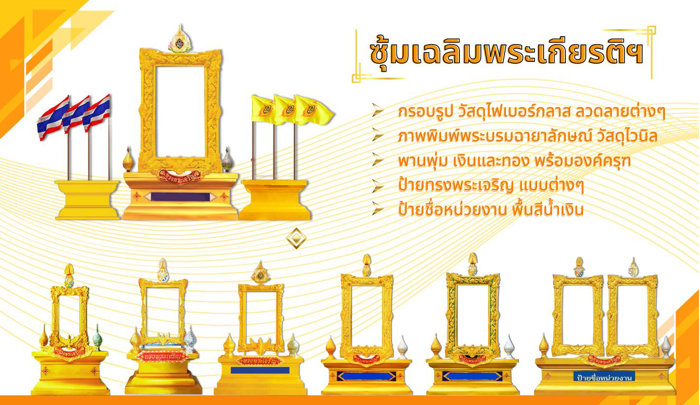 รายละเอียด : ประกอบไปด้วย กรอบรูปด้านบน ฐาน พานพุ่ม ริบบิ้นทรงพระเจริญ ตราสัญญลักษณ์ ครุฑ ชื่อหน่วยงาน ภาพพิมพ์ไวนิล