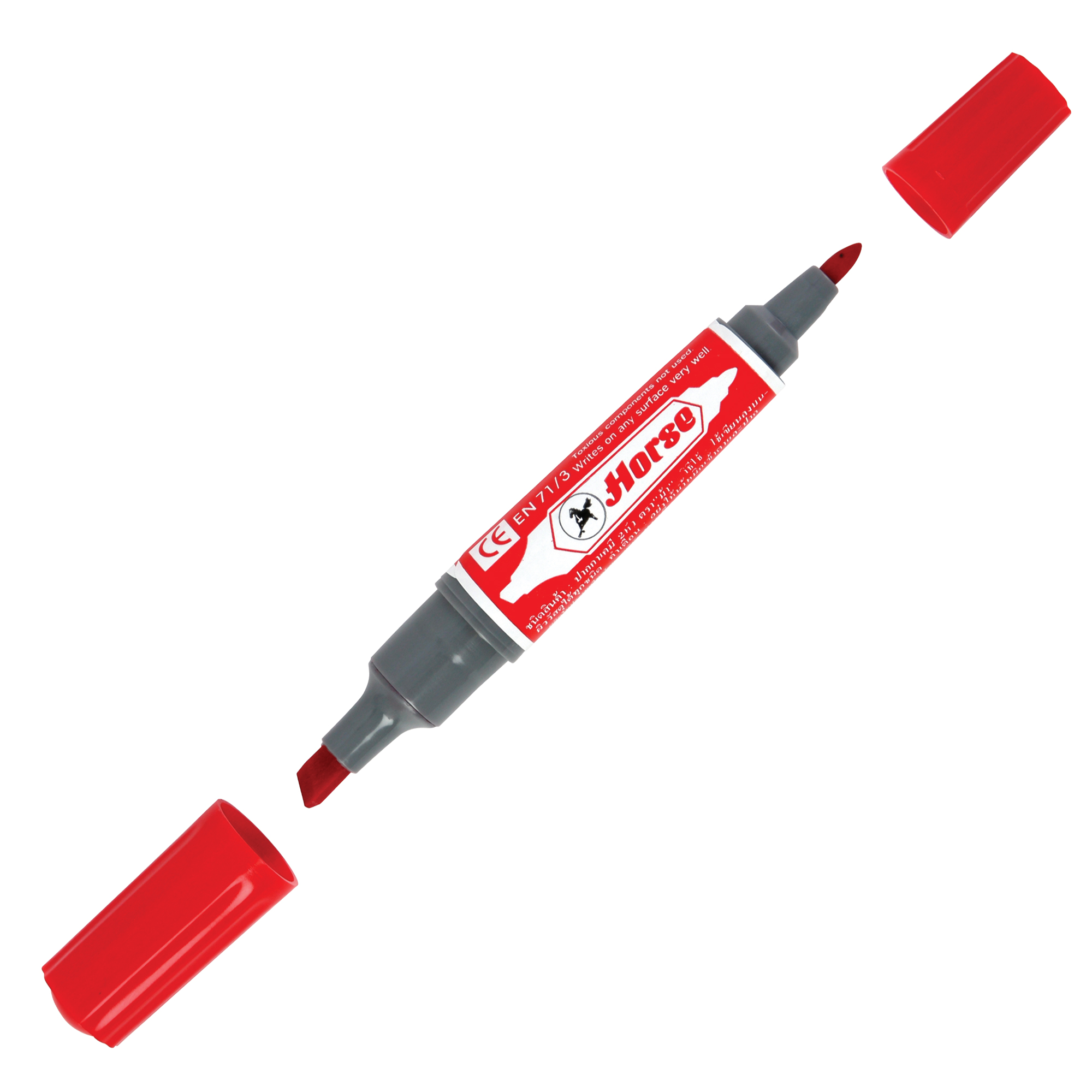 ปากกาเคมี ตราม้า 2 หัว หมึกสีเข้ม แห้งไว ติดทน กันน้ำ เป็นชนิดหมึก Permanent ลบไม่ได้ 2 หัวในด้ามเดียว สามารถเขียนบนกระดาษ พลาสติก โลหะ ไม้ และอื่นๆ ได้อย่างถาวร และยังสามารถเติมน้ำหมึกได้เมื่อหมึกซีดจาง ผ่านการรับรองมาตรฐานการปลอดสารพิษ ASTM D-4236 จากสหรัฐอเมริกา และ CE EN-71/3 จากสหภาพยุโรป ปลอดสารไซลีน 100 %